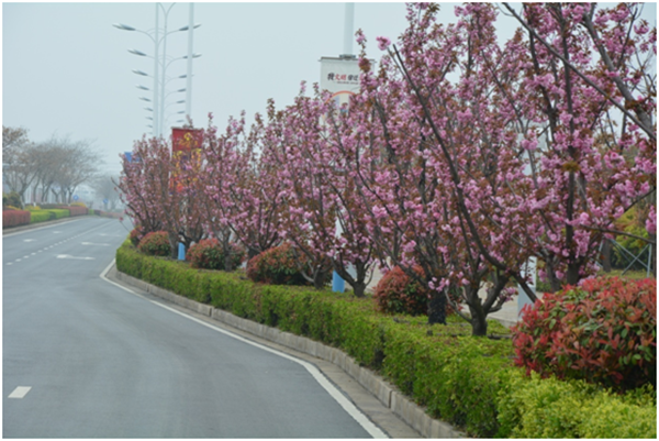 為把園區(qū)青海湖西路打造園區(qū)“櫻花大道”,按管委會部署,開發(fā)公司市政工程管理部對青海湖西路的行道樹進行整體更換,用櫻花代替原長勢不佳的廣玉蘭,經(jīng)過兩年的精心養(yǎng)護,整體長勢良好,每逢春季來臨櫻花盛開,為園區(qū)的景觀增添亮點,成為一道獨特靚麗的風景線。
