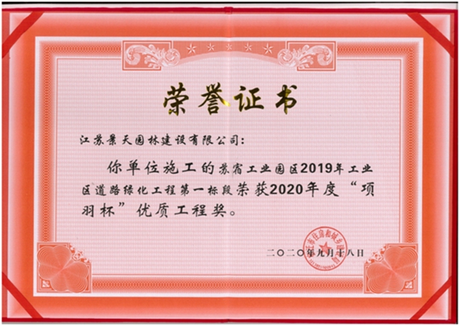 近日,由江蘇省蘇州宿遷工業(yè)園區(qū)開發(fā)有限公司建設管理的蘇宿工業(yè)園區(qū)2019年工業(yè)區(qū)道路綠化工程第一標段榮獲2020年度“項羽杯”優(yōu)質(zhì)工程獎。