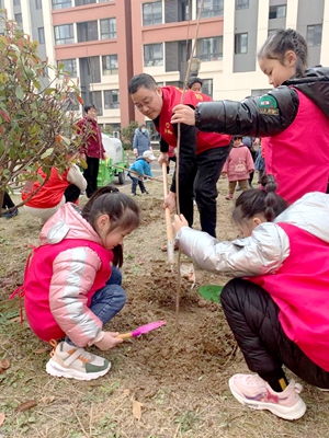 揮鍬鏟土、培土圍堰、提水澆灌……參加勞動(dòng)的志愿者與孩子們種下棵棵樹苗,播灑片片綠意,忙得不亦樂(lè)乎,植樹現(xiàn)場(chǎng)一片繁忙景象。