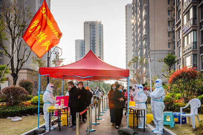一群黨員“點(diǎn)位長”,扛起疫情防控沉甸甸的責(zé)任 “請(qǐng)打開 ‘宿康寶’核酸檢測(cè)預(yù)約記錄,主動(dòng)出示給工作人員。”“請(qǐng)戴好口罩,保持一米線。”兩日來,在園區(qū)翡翠藍(lán)灣小區(qū)核酸檢測(cè)點(diǎn),排隊(duì)等候的小區(qū)居民總能看到臂戴黨員志愿者袖標(biāo)的城發(fā)公司行政人事部兼合約造價(jià)部總經(jīng)理李桂志在人群中忙碌的身影。每次核酸檢測(cè)前,他統(tǒng)籌安排,早早做好現(xiàn)場(chǎng)布置;檢測(cè)過程中,他不停進(jìn)行安全提醒,及時(shí)指導(dǎo)待檢人員提前做好微信小程序“宿康寶”的注冊(cè)和預(yù)約登記,幫助現(xiàn)場(chǎng)群眾快速便捷完成核酸檢測(cè)。