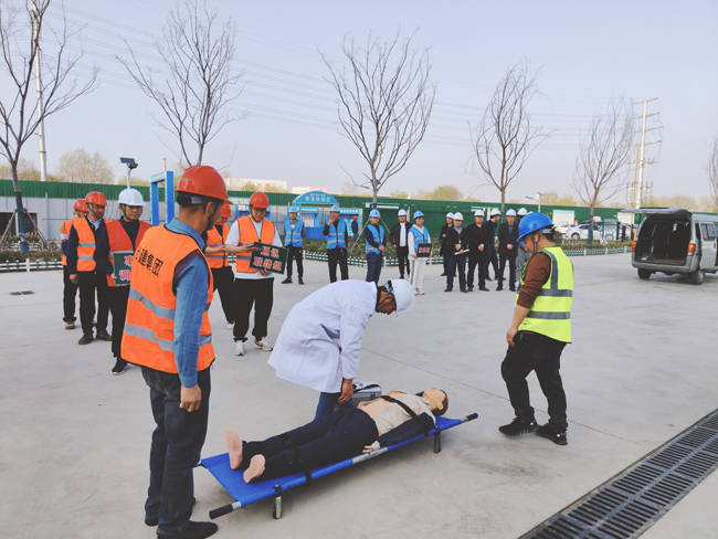 本次演練共分6個(gè)小組,分別為:現(xiàn)場(chǎng)模擬組、現(xiàn)場(chǎng)警戒(搶修)組、應(yīng)急救援(疏散)組、通訊聯(lián)絡(luò)組、事故調(diào)查組、 觀摩組。假設(shè)工人在生活區(qū)違規(guī)使用大功率電器突發(fā)火災(zāi),被煙霧和火勢(shì)圍困,二樓有人發(fā)出救援信號(hào),正在附近巡查的安全員發(fā)現(xiàn)情況后,立即趕赴現(xiàn)場(chǎng)并打電話(huà)給項(xiàng)目生產(chǎn)負(fù)責(zé)人,在接到通知后,項(xiàng)目生產(chǎn)負(fù)責(zé)人迅速安排項(xiàng)目部應(yīng)急救援辦公室負(fù)責(zé)人,并啟動(dòng)應(yīng)急預(yù)案,各救援小組立即到達(dá)現(xiàn)場(chǎng)開(kāi)展工作,安全員迅速引導(dǎo)全體人員有序從疏散樓梯疏散到安全位置,救援組帶著擔(dān)架、急救箱等趕赴現(xiàn)場(chǎng),將“受傷”人員用擔(dān)架從房?jī)?nèi)撤離到安全位置,同時(shí)救援醫(yī)生對(duì)“受傷”人員進(jìn)行簡(jiǎn)單的心肺復(fù)蘇、人工呼吸,并迅速送往醫(yī)院進(jìn)行治療。