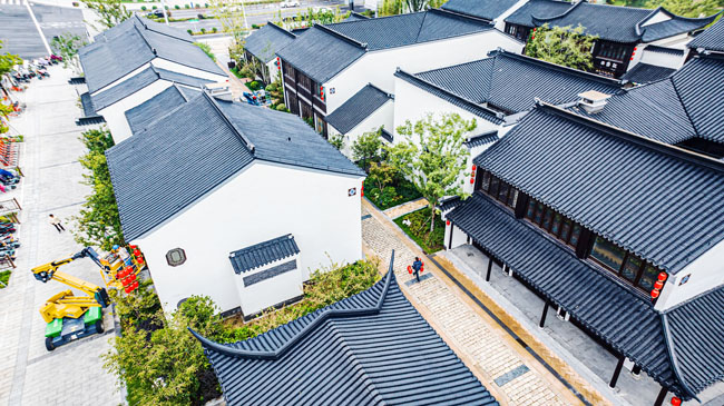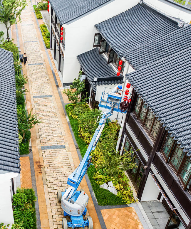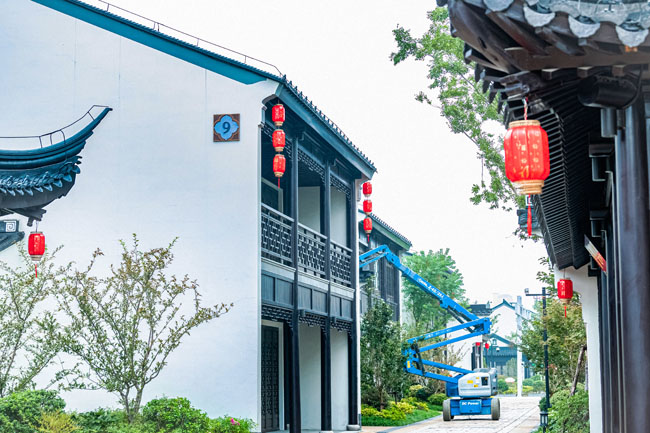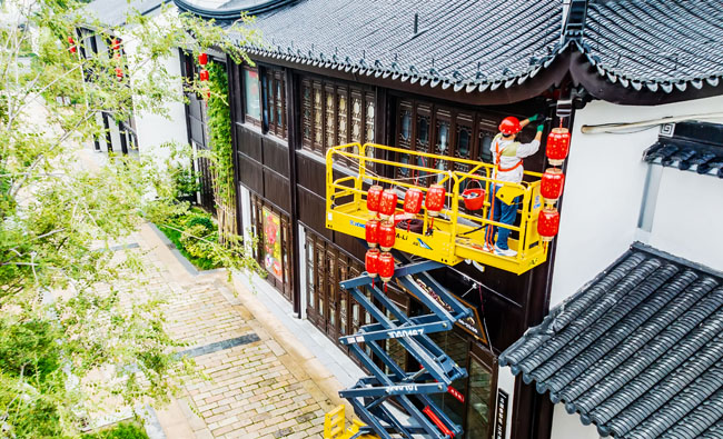 2023年9月25日,蘇宿工業(yè)園區(qū)蘇州街,工人們正在掛燈籠,喜迎中秋、國(guó)慶雙節(jié)到來。大紅燈籠與白墻青瓦綠樹相映成趣,成為一道靚麗的風(fēng)景線,營(yíng)造了歡樂、喜慶、祥和的節(jié)日氛圍。