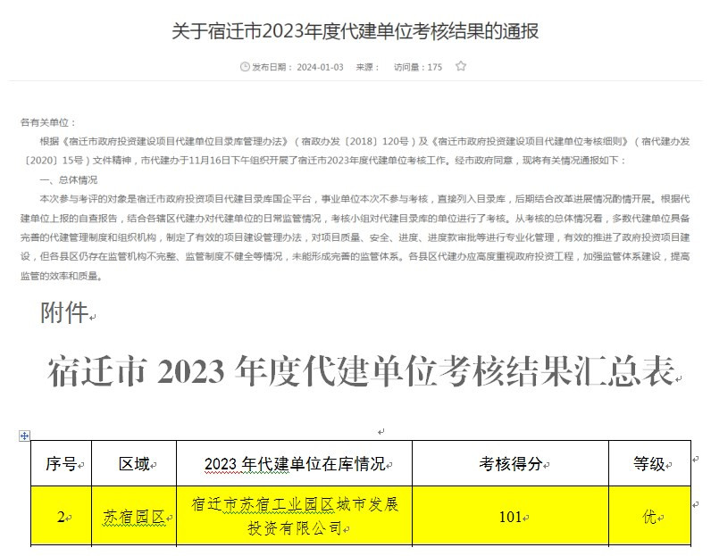近日,經(jīng)市政府同意,由宿遷市政府投資建設(shè)項(xiàng)目代建管理辦公室通報宿遷市2023年度代建單位考核工作結(jié)果,城發(fā)公司以101分高分通過本次考核。