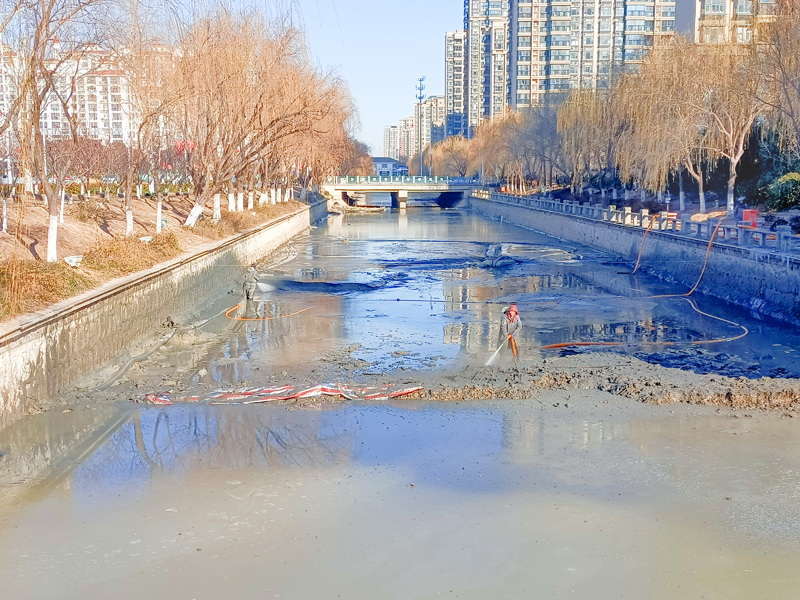 園區(qū)利民河全長1.1公里、寬20米,為區(qū)內(nèi)景觀河。經(jīng)前期摸排,河道內(nèi)淤泥沉積較多,影響河道自凈能力。城發(fā)公司克服冬季氣溫低、斷面長、施工難等不利因素,采用泥漿泵配合高壓水槍射水,管道封閉運(yùn)輸?shù)氖┕し椒ǎ謇碛倌嗉s8500立方米,高效完成河道清淤工作。