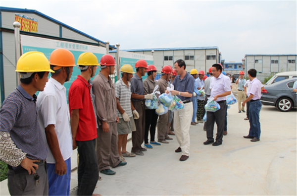 8月11日上午,園區(qū)黨工委委員、規(guī)劃建設局局長周原帶隊來到夢家園、許莊變、2014年市政二標等項目工地,檢查防暑降溫措施落實情況,并慰問奮戰(zhàn)在高溫一線的建筑工人。