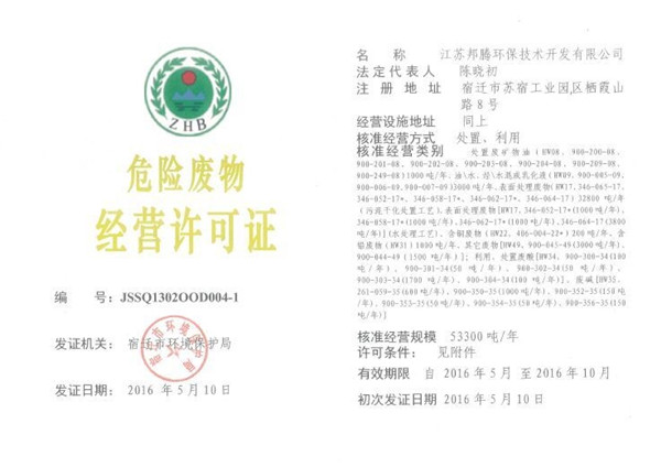 近日,園區(qū)江蘇邦騰環(huán)保技術(shù)開發(fā)有限公司獲頒由宿遷市環(huán)保局頒發(fā)的危險廢物經(jīng)營許可證,主要從事利用、處置廢礦物油、廢酸、廢堿、表面處理廢物等,處理量為53300噸/年。